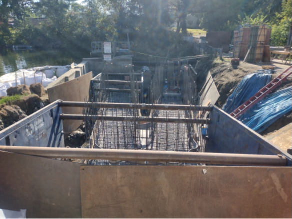 As can be seen from the photo below, significant progress has been made on the upgrade to the Webber Pond Fishway, but there is a fair bit of work yet to be done. After a slow start at the beginning of the summer, we thought we could make up time, especially with the good weather, but we have not been able to get caught up to schedule as quickly as hoped. We still expect to complete the work requiring an “in-water” component by September 30, as required by the federal and state permits. (That is, the stream-side entrance and the pond-side exit of the fishway will be completed and backfilled, the sandbags will be out of the pond, and the water diversion culvert will be out of the stream, with the stream flowing freely.) The concrete placement of the floor of the fishway, as well as the walls at the entrance to the fishway, is scheduled to be completed tomorrow. However, the Dam Road will need to remain closed for an additional two to four weeks of construction, potentially through the end of October. During that time, the walls at the fishway exit and the center portion of the fishway will be completed, and the rest of the site will be back-filled and graded. Part of the delay will be due to the fact that each section of the fishway walls need to cure for seven days after the concrete is placed, before we can safely backfill around them. That imposes unavoidable delays as we wrap up the final steps. We apologize for any inconvenience that this additional road closure causes to Dam Road and McQuarrie Road residents.